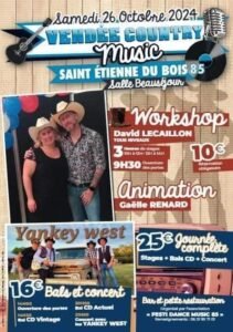 Le Samedi 26 Octobre 2024, Journée Country à partir de 09h30, animée par *Gaelle Renard*, avec Workshop de *David Lecaillon* et Concert du Groupe *Yankey West*, Salle Beauséjour, à