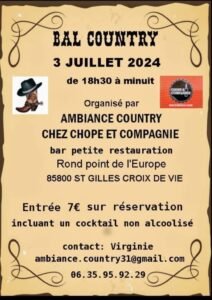 Le Mercredi 03 Juillet 2024, *Ambiance Country* organise un Bal Country , de 18h30 à Minuit, Chez *Chope et Compagnie*, Rond Point de L’Europe, à St Gilles Croix de Vie (85800