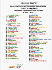 Le Mercredi 11 Septembre 2024, Bal Country chez *Ambiance Country Chope et Compagnie*, de 18h30 à Minuit, Rond Point de L’Europe, à St Gilles Croix de Vie (85800), Vend