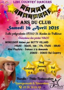 Le Samedi 26 Avril 2025, Journée Country chez *Line Country Dancers*, à partir de 14h00, avec Workshop de *Betty Villard*, Salle Polyvalent