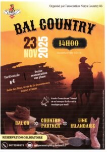 Le Dimanche 23 Novembre 2025, Après Midi Bal Country à 14h00, organisé par l’association *Norya Country 86*, Salle des Fetes, 06 rue du Dr Deso
