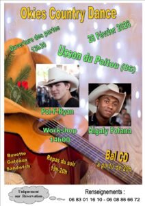 Le Samedi 28 Février 2026, Journée Country des *Okies Country Dance*, à partir de 14h00, , avec Workshops de *Pol.F Ryan* et *Algaly Fofana*, Repas du