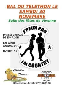 Le Samedi 30 Novembre 2024, Bal Country chez *Country Dance Vivonne*, au profit du Téléthon, de 20h00 à 01h00, précédé de Danse Vintage de 15h00 à 20h00, Salle des Fetes de V