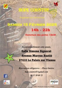 Le Samedi 15 Février 2025, Après Midi Bal Country annuel chez *Hope Country*, de 14h00 à 22h00, Salle Simone Signoret, Avenue Maryse Bastié, Le Palais sur Vienne (87410), Haute Vienne.