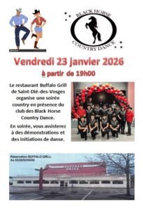 Le Vendredi 23 Janvier 2026, Soirée Country des *Black Horse Country Dance*, à 19h00, au Restaurant *Buffalo Grill* de Saint Dié des