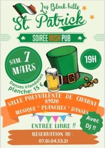 Le Samedi 07 Mars 2026, Soirée Irish Pub pour la St Patrick, avec Danses Irlandaises, à 19h00, Salle Polyvalente de Charny (89120), Yonne.