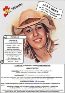 Le Samedi 27 Septembre 2025, Journée Country des *NB Country*, à partir de 15h00, avec Workshop et Bal Country Concert animé par *Lilly West*, à 20h00, à Venizy (89210), Yonne.