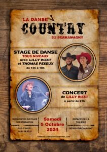 Le Samedi 05 Octobre 2024, Journée Country à partir de 14h00, avec Stages de Danse de *Lilly West* et *Thomas Peseux* et Concert de *Lilly West * à 21h00, Espace de la Tuilerie, à Giromagny (90200), Territoire de Belfort