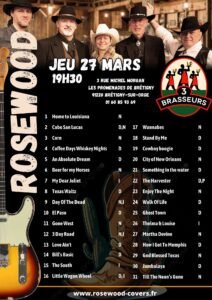 Le Jeudi 27 Mars 2025, Soirée Concert de *Rosewood Covers*, à 19h30, au Restaurant *3 Brasseurs* , 3 rue Michel Morgan, Les Promenades de Brétigny, à Brétigny sur Orge (91220), Essonne.