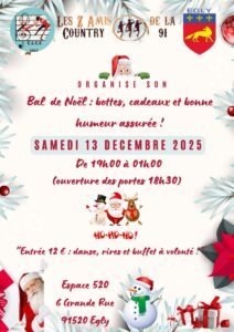 Le Samedi 13 Décembre 2025, Bal Country de Noel de *Les Zamis de la Country*, de 19h00 à 01h00, Espace 520, 6 Grande rue, à Egly (91520), Essonne.