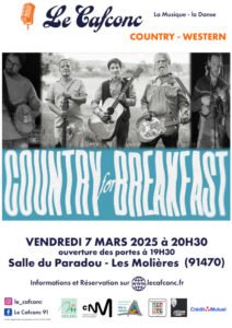 Le Vendredi 07 Mars 2025, Soirée Country avec Concert des *Country For Breakfast*, chez *Le Calfonc Country Western*, à 20h30, Salle du Paradou, Les Molières (91470), Essonne.