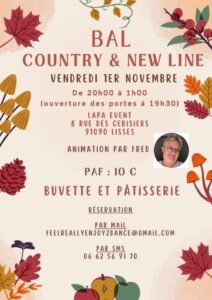 Le Vendredi 1er Novembre 2024, Bal Country et New Line, animé par *Fred*, de 20h00 à 01h00, Lapa Event, 08, rue des Cerisiers, à Lisses (91090), Essonne .