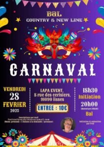 Le Vendredi 28 Février 2025, Bal Country et New Line Thème Carnaval, Lapa Event, 08, rue des Cerisiers, à Lisses (91090), Essonne.