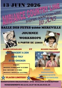 Le Samedi 13 Juin 2026, journée Country Line Dance chez *Ambiance Country Line*, qui Fetera ses à partir de 10h00, avec Workshops de *David Lecaillon* et *Regine Bayard*, Concert à 20h00 avec *Toly et DJ Chicken*Salle des Fetes de Mereville (91660), Essonne.