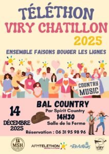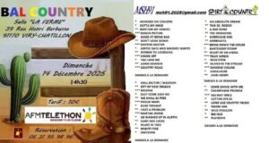 Le Dimanche 14 Décembre 2025, Après Midi Bal Country pour le Téléthon, chez *Spirit Country*, à 14h30, Salle de la Ferme, à Viry Chatillon (91), Essonne.