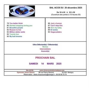 Le Samedi 20 Décembre 2025, Journée Country Line à partir de 10h30, avec Workshop de *Niels Poulsen*et Bal Country Line ACCB, au Gymnase Jesse Owens, à Bobigny (9