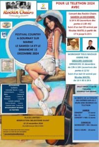 Les Samedi 14 et Dimanche 15 Décembre 2024, Festival Country avec Concert des *Rockin Chairs*, Workshop animé par *Gregory Danvoie*, bal cd animé par *Nicolas Watel*, au profit du Téléthon, Salle Vanzo, 05, rue de L’alouette, à Gournay sur Marne (93), Seine St Den