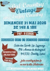 Le Dimanche 31 Mai 2026, Après Midi Bal Country Vintage, avec *Enjoy Country*, de 14h00 à 18h00, Salle des Sports Léo Lagrange, 196 Avenue de Stalingrade, à