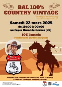 Le Samedi 22 Mars 2025, Bal 100% Vintage animé par *Olivier Country *, de 19h00 à 00h00, au Foyer Rural de Bernes (95), Val D’oise.