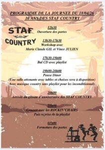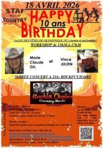 Le Samedi 18 Avril 2026, Journée Country des *Staf Country*, quii Feteront leurs 10 ans, à partir de 13h30, avec Workshop de *Marie Claude Gil* et *Vince Julien* et Soirée Concert des *Rockin’Chairs Country Music*, à 21h00, Salle des Fêtes, Chemin de Préfontaine, à Genainville