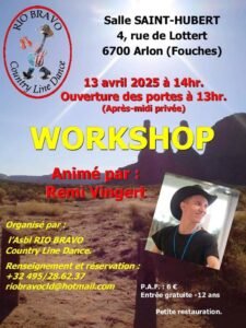 Le Dimanche 13 Avril 2025, Après Midi Country Dance animée par *Remi Vingert*, à 14h00, chez *L’ASBL Rio Bravo Country Line Dance*, Salle st Hubert, 4 rue de Lottert, à Ar