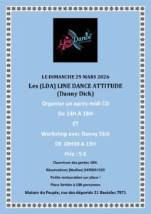 Le Dimanche 29 Mars 2026, Journée Line Dance Attitude de 10h30 à 18h00, avec Workshop de *Danny Dick* et Après Midi cd , Maison du Peuple, rue des Déportés, à Basècles (7971), B