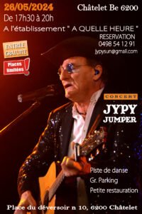 Le Dimanche 26 Mai 2024, Soirée Country avec Concert de *Jypy Jumper*, de 17h30 à 20h00, à L’établissement *A Quelle Heure*, Place du