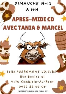 Le Dimanche 14 Décembre 2025, Après Midi Bal Country cd , avec *Tania & Marcel*, à 14h00, Salle Géromont Loisirs, rue Bovire 21, à Comblain au Po
