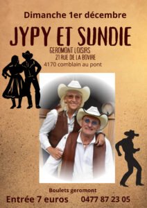 Le Dimanche 1er Décembre 2024, Après Midi Country Music et Dance, avec *Jypy et Sundie*, Salle Geromont, 21, rue de la Bovire, à Comblain au