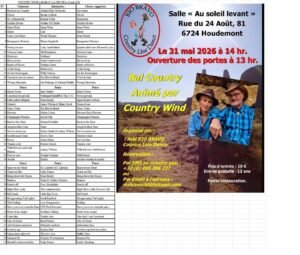 Le Dimanche 31 Mai 2026, Après Midi Bal Country à 14h00, animée par *Country Wind*, Salle *Au Soleil Levant*, rue du 24 Aout, à Houdemont (6724), Belgique.