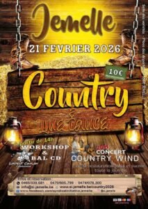 Le Samedi 21 Février 2026, Journée Country Line Dance à partir de 14h00, avec Workshop, Bal cd et Concert des *Country Wind*, à 20h00, à Jemelle (5580), Belgique.