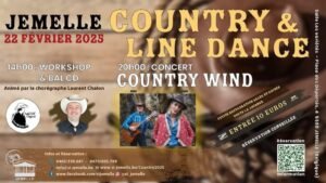 Le Samedi 22 Février 2025, Journée Country Music et Dance à partir de 14h00, avec Workshop et Bal cd animés par *Laurent Chalon*, puis un Concert de *Country Wind*, à 20h00, à Je