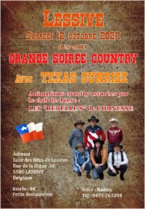 Le Samedi 12 Octobre 2024, Grande Soirée Country Dance chez *Les Rebelle’s*, avec Concert de *Texas Sunrise*, à 20h00, Salle des Fetes, rue de la Digue, 26, à Lessive (5580), Be