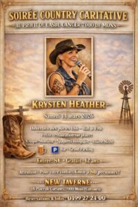 Le Samedi 14 Mars 2026, Soirée Country Caricative à 19h00 , avec Concert de *Krysten Heather*, New Taverne, 18 Place de Cuesmes, à Mons (7000), Belgique.