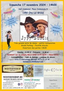 Le Dimanche 17 Novembre 2024, Après Midi Country Music et Dance, à 14h00, avec Concert de *Jypy et Sundie*, Hall Communal, Place Communale 5, à Orp le Grand (1350), Belgique.