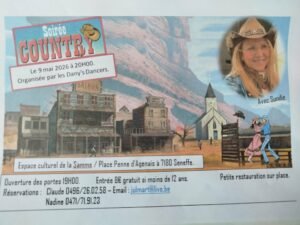 Le Samedi 09 Mai 2026, Soirée Country à 20h00, chez *Dany’s Dancers*, avec *Sundie*, Espace Culturel de la Samme, Place Penne D’Agenais à Seneffe (7180), Belgique.