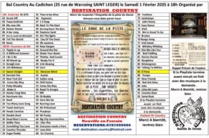 Le Samedi 1er Février 2025, Bal Country à 18h00, organisé par *Destination Country*, au Cadichon, 25, rue de Warcoing, à St Leger (7730), Belgique.