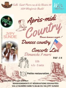 Le Dimanche 09 Mars 2025, Après Midi Bal Country avec Concert de *Jypy Sundie*, à 15h00, Salle St Pierre, rue de la Closière, 48, à Wanfercée Baule