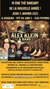 Le Jeudi 02 Janvier 2025, Après Midi 19ème Thé Dansant Country,avec *Alex Klein & Band*, de 13h30 à 19h00, L