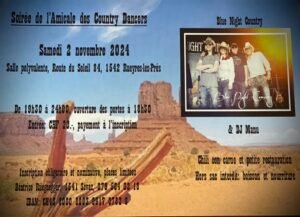 Le Samedi 02 Novembre 2024, Soirée Country de *L’amicale des Country Dancers*, de 19h30 à 24h00, Salle Polyvalente, Route du So